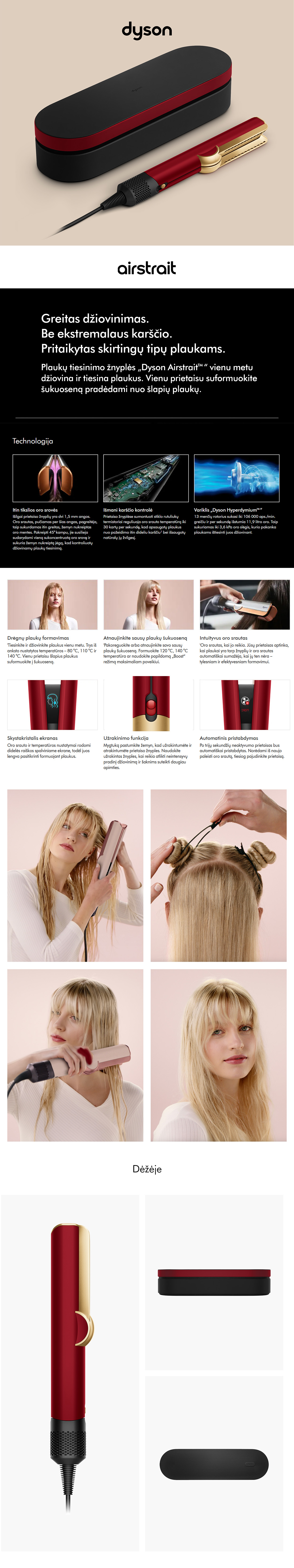 Atraskite nepriekaištingų plaukų paslaptį su DYSON HT01 Airstrait plaukų formavimo prietaisu. Raudono velveto ir aukso spalvų elegancija dera su pažangia technologija, suteikiančia greitą, švelnų ir profesionalų rezultatą kiekvieną dieną.
