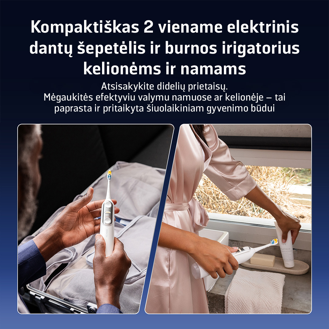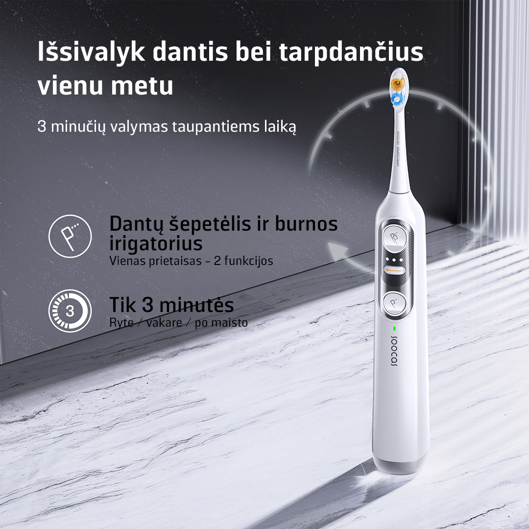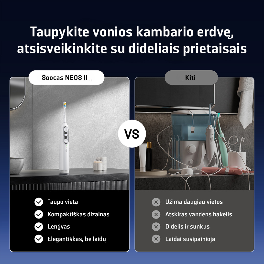 Pavargote nuo daugybės prietaisų vonios kambaryje? Soocas NEOS II sujungia galingą dantų šepetėlį ir vandens irigatorių viename elegantiškame įrenginyje. Puikiai tinka užimtiems žmonėms, ieškantiems greitesnio ir efektyvesnio sprendimo.