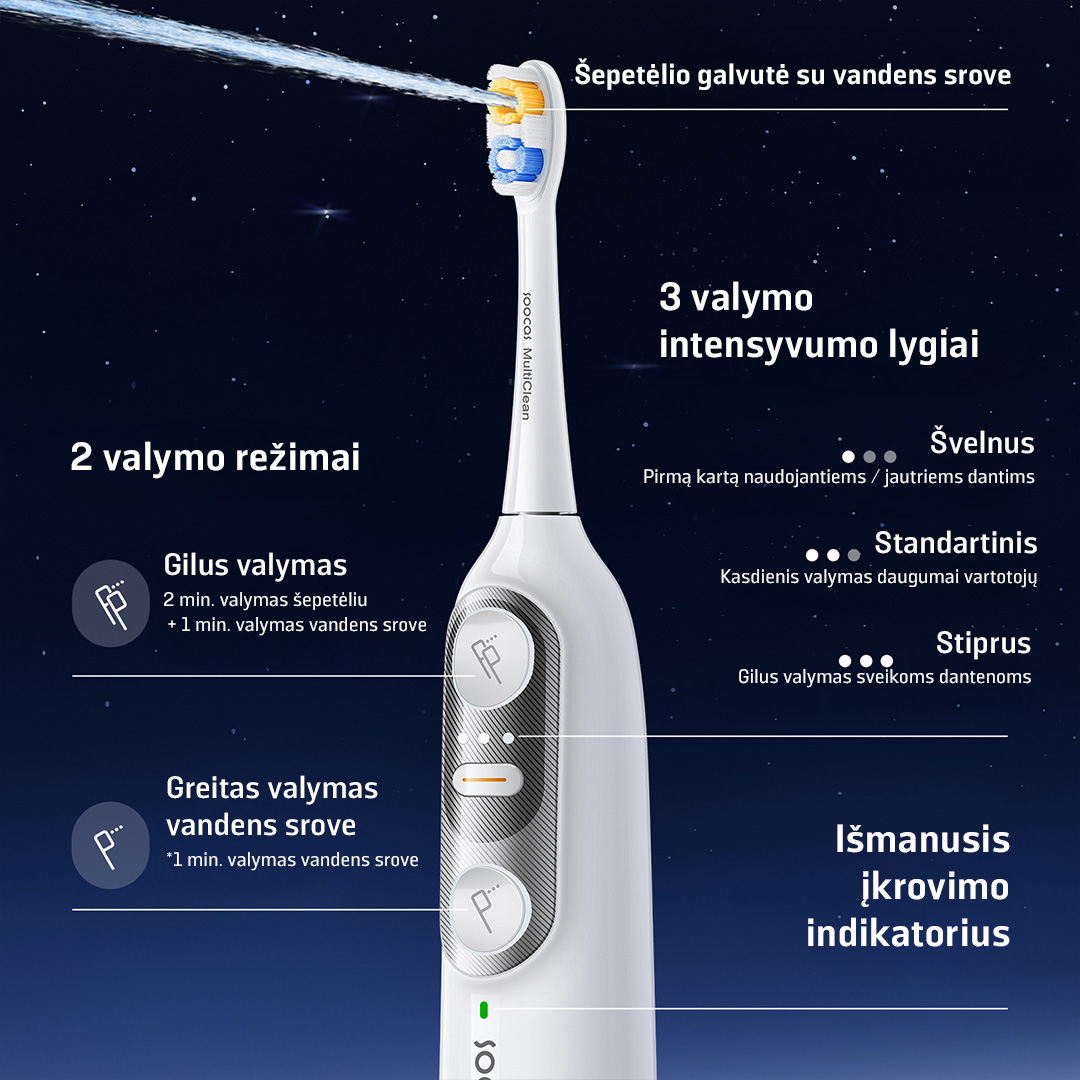 Integruotas mini vandens siurblys, pompos variklis ir tuščiaviduris sonic variklis užtikrina gilų valymą net sunkiai pasiekiamose vietose, kurių paprasti dantų šepetėliai nepasiekia.
